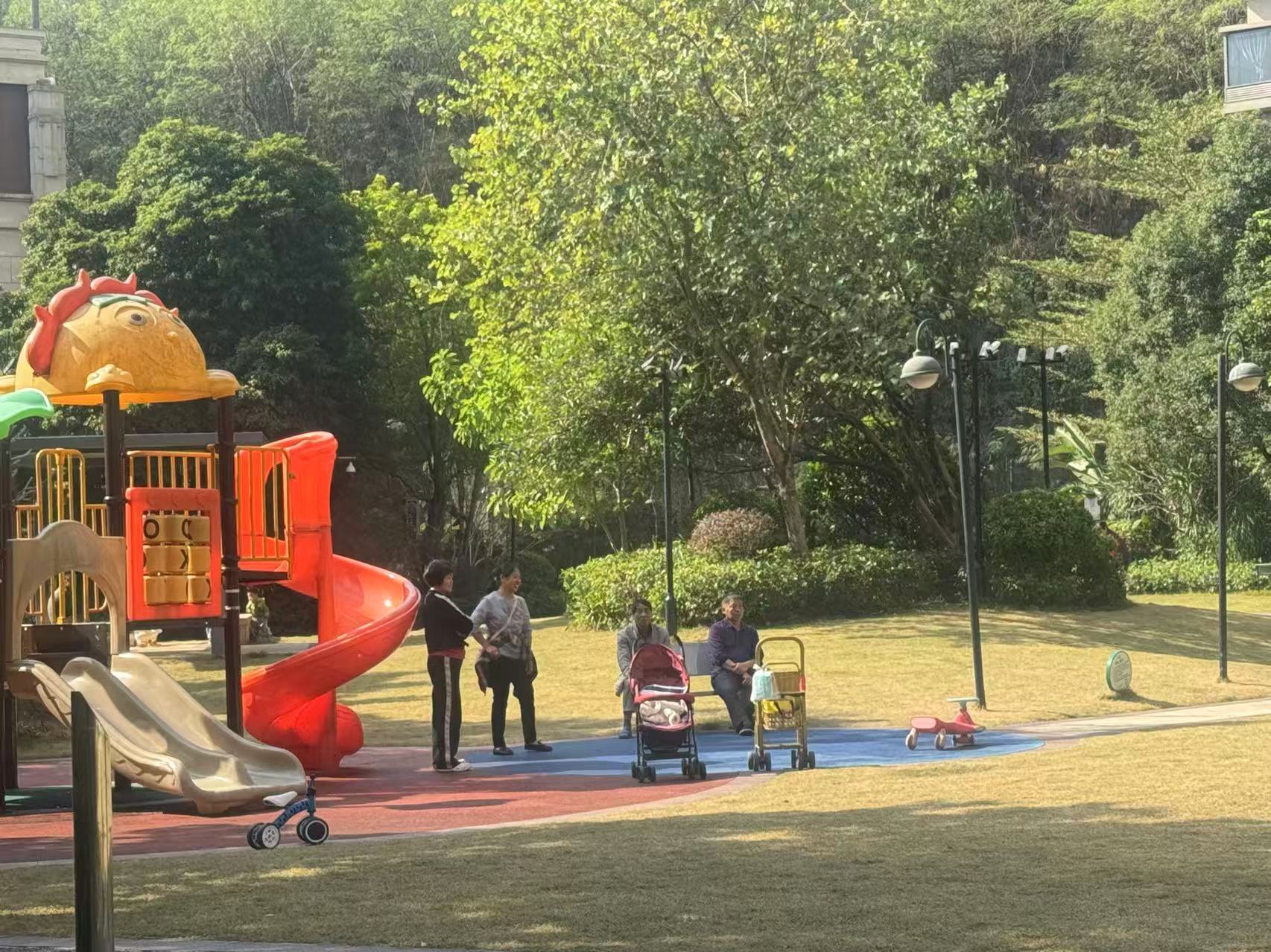 金融街融穗御府小区业主在修整好的草坪和游乐土失业文娱。 南边+记者 周中雨 摄