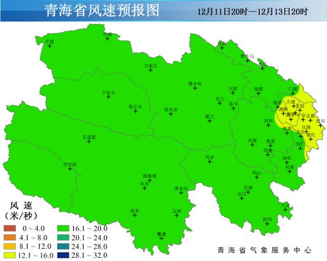 青海省12月11昼夜间至13日白昼大风预告图如下: