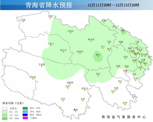 青海省12月11昼夜间至13日白昼积蓄降水量预告图如下: