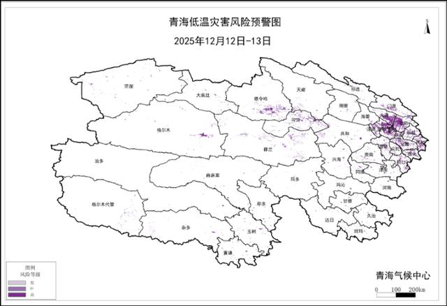 12月12日至13日青海省低温灾害风险预警图如下: