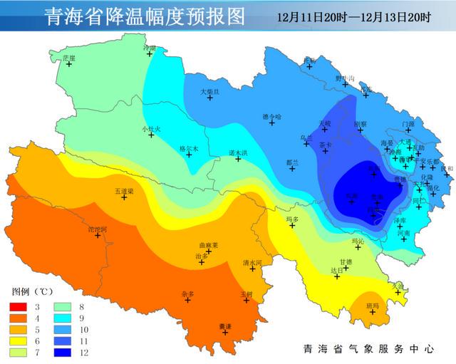 青海省12月11昼夜间至13日白昼降温预告图如下:
